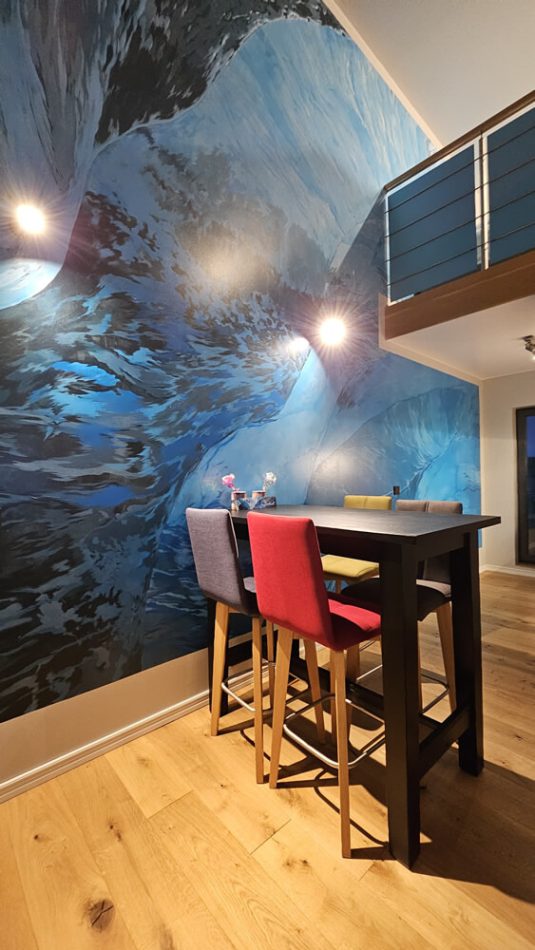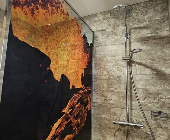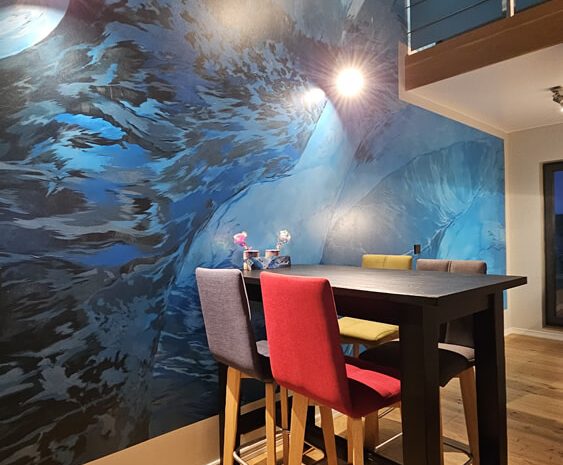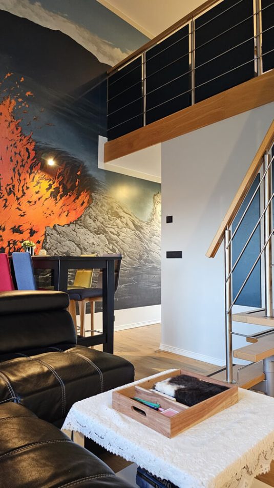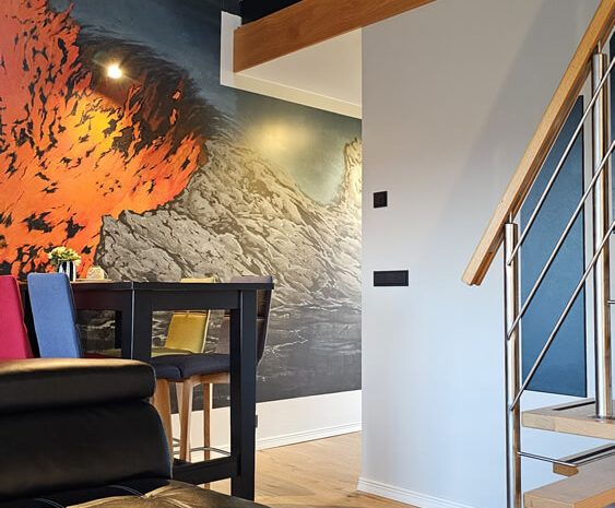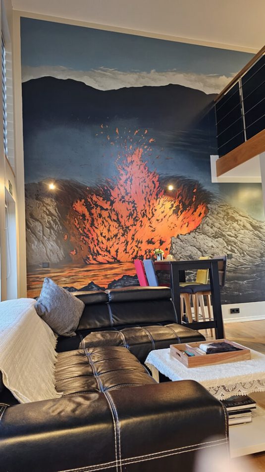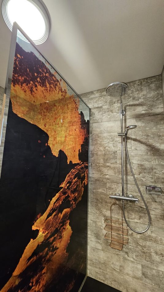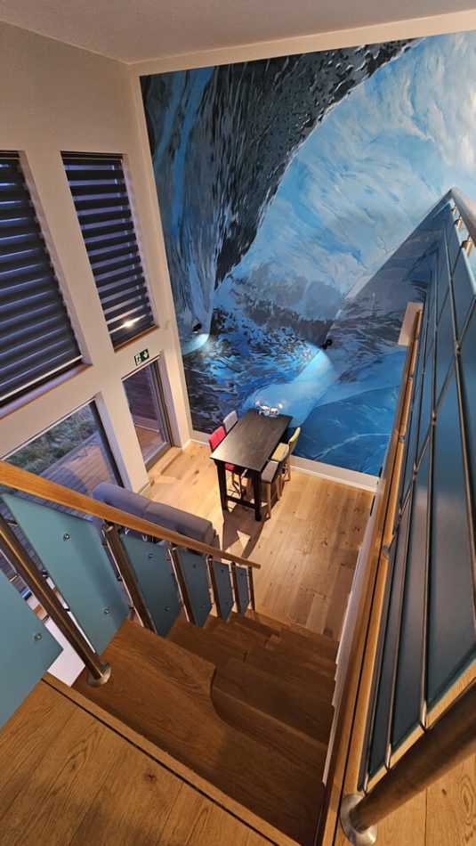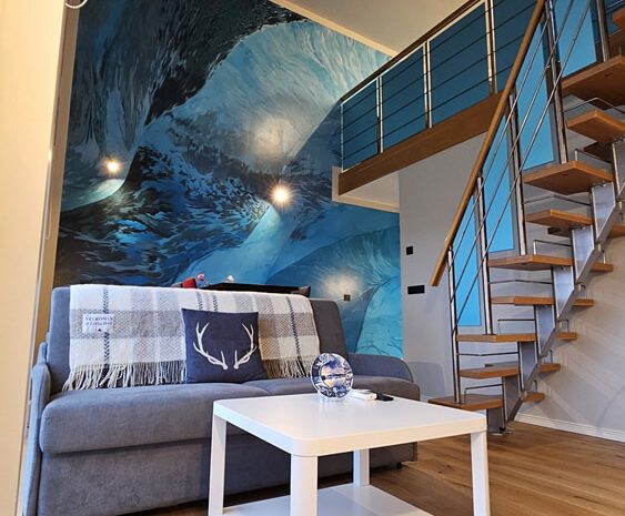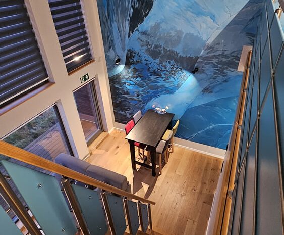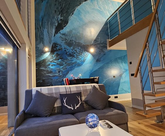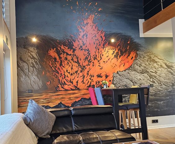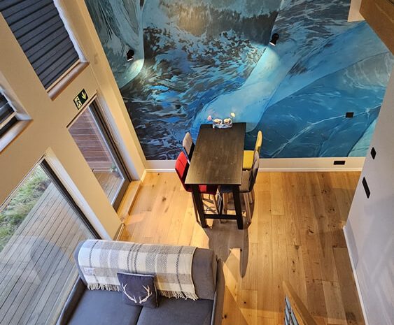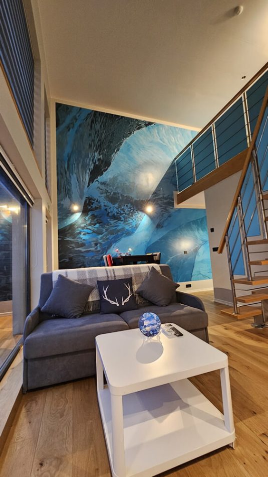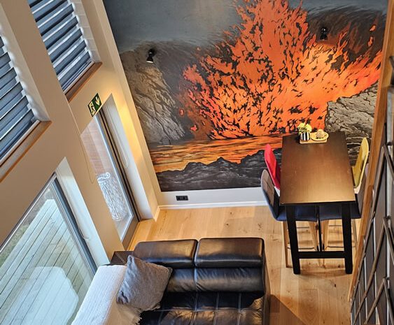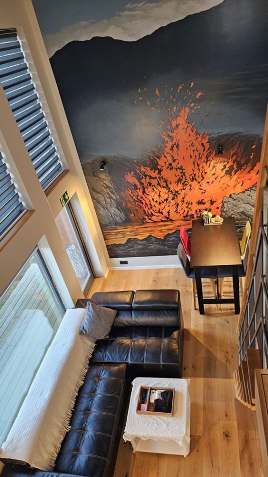 Each cabin features a full-wall artwork inspired by either the Northern Lights or volcanic lava, giving every stay a unique atmosphere.